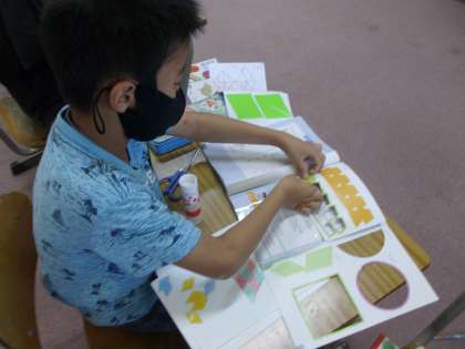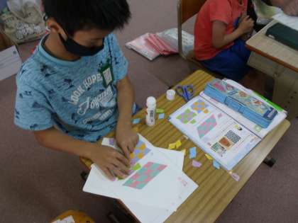 「図形」の学習です。同じ形を敷き詰めました。