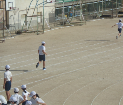 50メートル走をしました。腕をよく振り、自己ベストを伸ばしましょう!