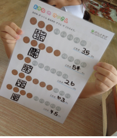 お金の学習で、1円、5円、10円の組み合わせを数えました。