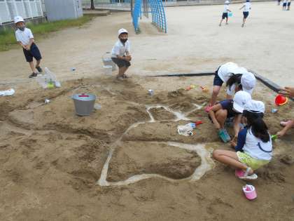 みんなで川と山と池をを作ってそこに水を流し込むと,