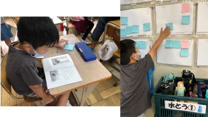 教室に置かれた作品を読んで付箋に感想を書き,後ろの掲示板の同じ題名の用紙に貼っていきます。