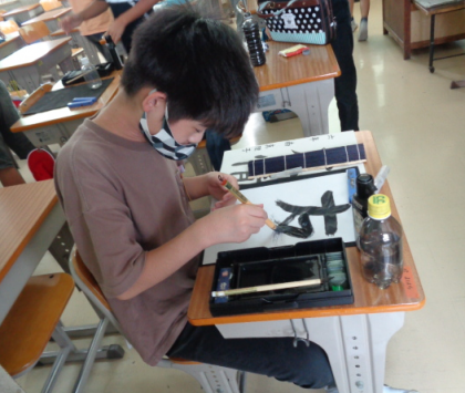 『友情』と書きました。気持ちが入るとついつい一文字目が大きくなってしまうので、半分に折ってから書くようアドバイスすると、バランスよく書くことができました。