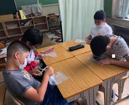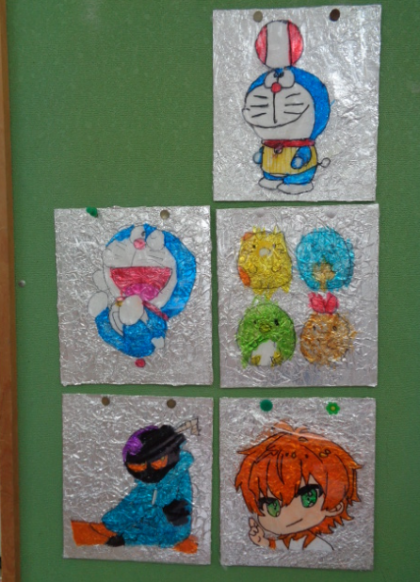 ステンドグラスづくりでは、好きなキャラクターということで、皆はりきって作っていました。キャラクターの配色が分からず困っていると教えあったり、出来上がった作品を誉めあったりと、とてもよい雰囲気でした。