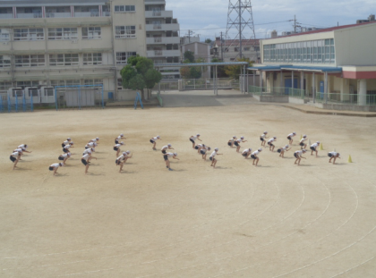 運動場で裸足で、ソーラン節の練習をしました。気合が入ります!