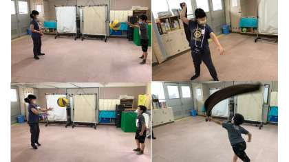 二人とも,両手投げをしていたので,バスタオルで投げるモーションとボールで片手投げの練習をしました。