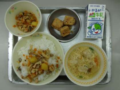 10月7日の給食は「セルフ秋の風味ごはん、牛乳、むらくも汁、厚揚げのみぞれがけ」でした。