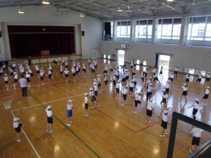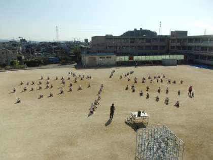 運動場では隊形移動の確認,体育館ではフィニッシュまで練習しました。