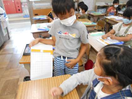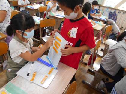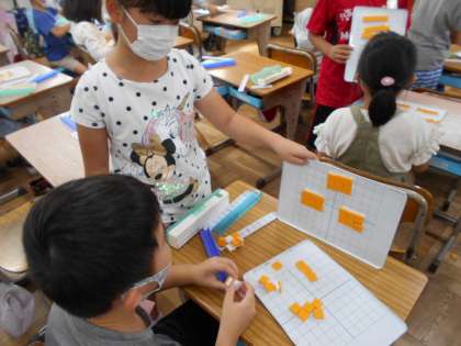 お隣が並べたブロックを見て,かけ算の式を答えるゲームをしました。(一つ分の数)×(いくつ分)のきまりに気をつけて考えられました。