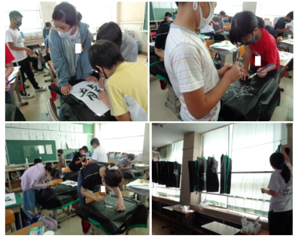 友だちが紙を押さえてくれて、協力しながら法被に文字を書きました。順番に書いているので、少しずつ完成していく予定です。