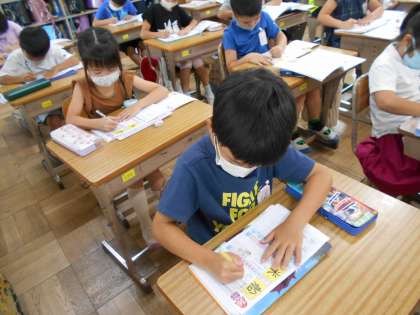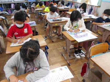 新出漢字の学習に取り組んでいます。姿勢よく,集中して書くことができています。