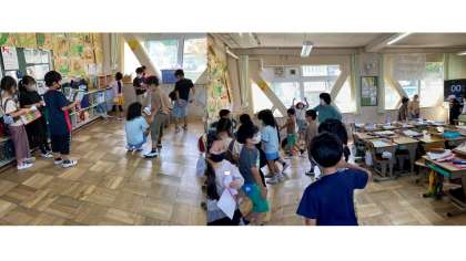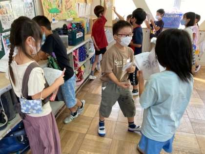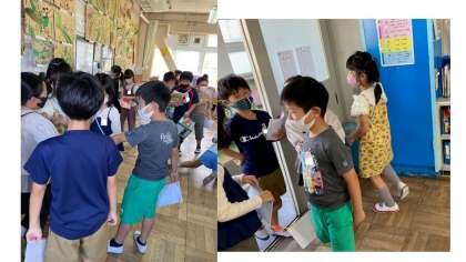机を動かしてスペースを作り,各グループがそれぞれ,セリフやナレーションを言いながら,動きの工夫をがんばっていました!