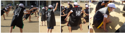 初めて法被を着ての練習です。なんだか格好いい!急いで法被を脱ぐ場面もあるので、練習していきます。