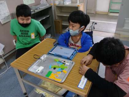 今日のテーマは「洪水を防ごう」でした。レゴブロックでは,「ダム」を建設しました。
