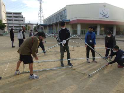 体育参観に向けて,本部テントを立てました。休み時間に触ったり,ぶら下がったりしないようにしましょう。明日は,体育参観の前日準備があるので,13:30下校です。