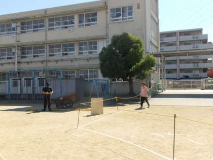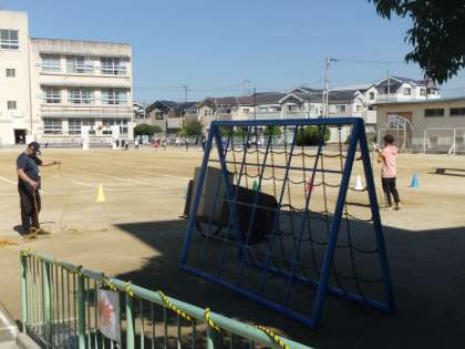 午前中の間,トラロープを教頭先生と教務の先生が張ってくれていました。