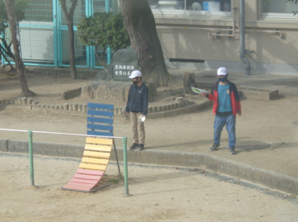 運動場で理科の学習をしていました。