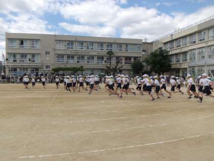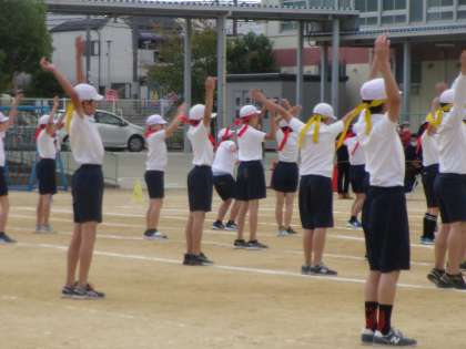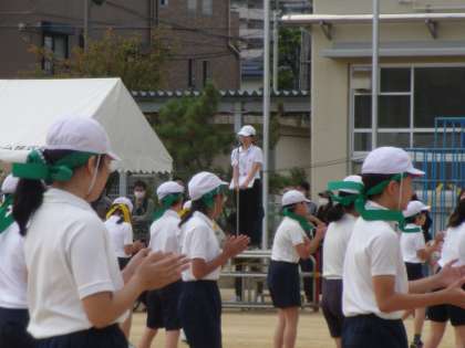 体育参観の締めをくくる6年生が始まりました。6年生は堺っ子体操→短距離走→ソーラン節の順で発表しました。