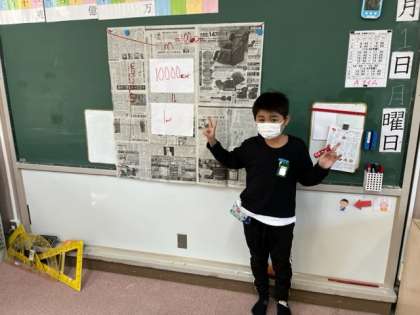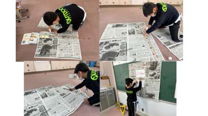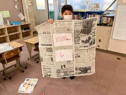 教科書54ページ「新聞紙で1平方メートルを作り,大きさを感じ取ろう。」というめあてで,新聞紙4枚で1平方メートルを作りました。