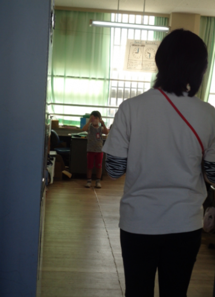 視力スクリーニングの検査をしました。指で方向を伝えています。