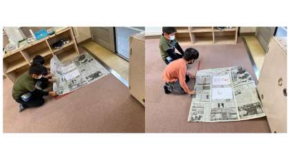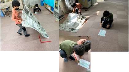 1平方メートルの新聞紙が,なかよし学級の教室に何枚敷きつめられるか予想をたててから,実験をしました。