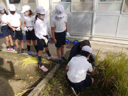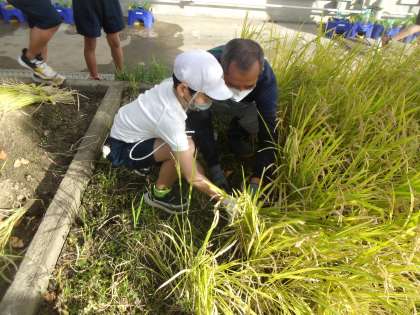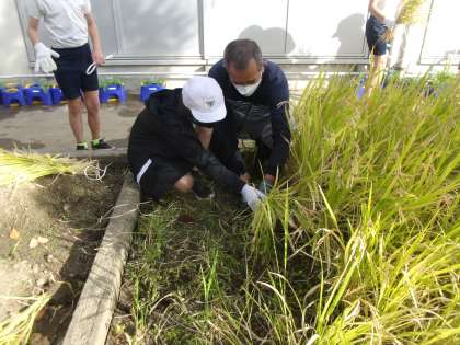 1学期に植えた稲に穂が付きました。軍手と鎌をもって,稲刈り体験をしました。