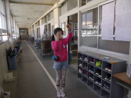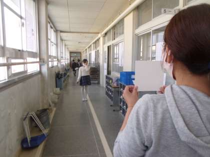 明るい廊下で視力検査をしました。小さいマークをしっかり見て答えていました。