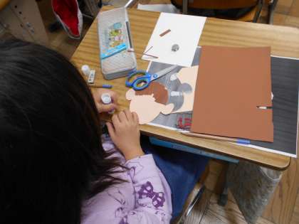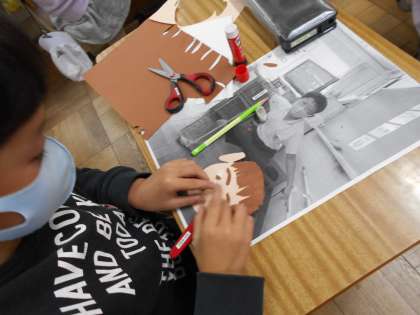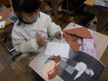 体育大会でがんばった自分の姿を版画にします。今日は,顔の部分を作りました。