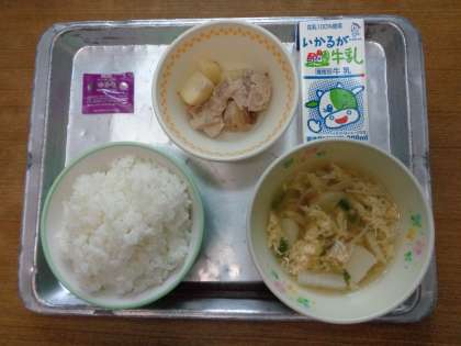 11月12日の給食は「ごはん、牛乳、長いものかきたま汁、みそマヨガーリック焼き、ふりかけ(ゆかり)」でした。