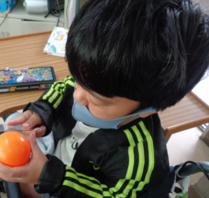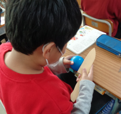玩具の包丁とボールで、皮をむく練習をしました。指の位置に注意してゆっくりと。本番に活かせますように。