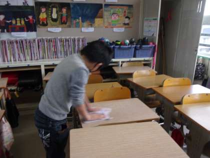 給食当番もがんばっています。寒くなり,冷たい水を絞って台ふきをしてくれています。