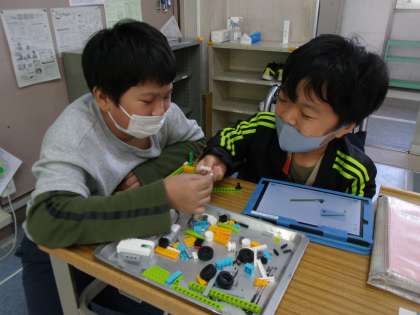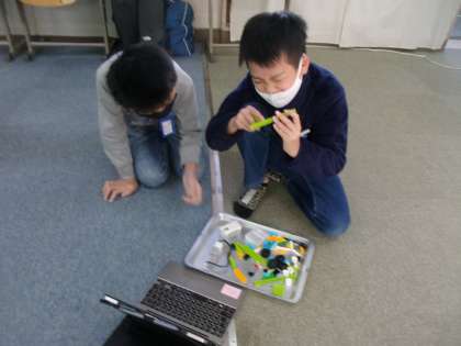 「ゴミ収集車」をレゴブロックで組み立てました。荷台を傾けられるようにブロックの組む場所も考えながら取り組んでいました。