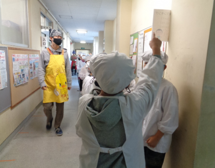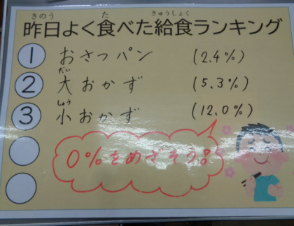 残食量調査の実施に合わせて、今週は学校全体の残食率を調べ、ランキング形式で掲示することにしました。子どもたちは興味をもっており、ランキング発表を楽しみにしているようです。