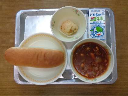11月17日の給食は「コッペパン、牛乳、ビーンズシチュー、コーンブレッド」でした。