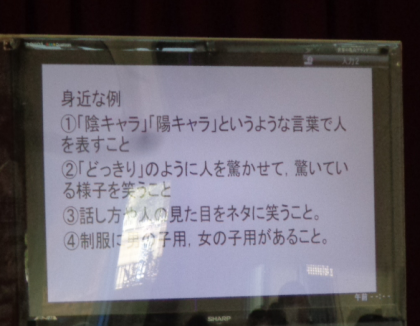 今年度は自校のみで人間学習交流会がありました。渋染一揆を通して身近な例1〜4について「あってもいいことなのか、あってはならないことなのか」、まず自分で考え、皆で意見を伝え合いました。一人一人アンテナが違うので人権意識も違うこと、深く考えて行動に起こすこと、少数派の人の気持ちも思いやること等を学びました。ご家庭でもぜひお子さんと話し合ってみてください。