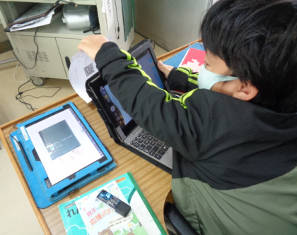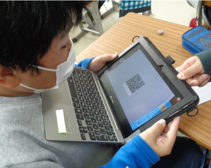 タブレットでQRコードを読み込み、生活アンケートに回答しました。なかなか読み込めず困っていると、友だちが手伝ってくれました。