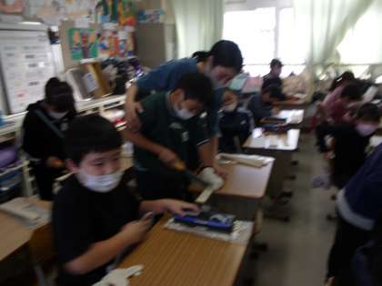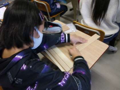 「ギコギコとんとんクリエイター」の学習に入りました。初めてのこぎりの学習で先生の話を一層真剣に聞いていました。ルールを守って安全に使うことができました。