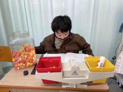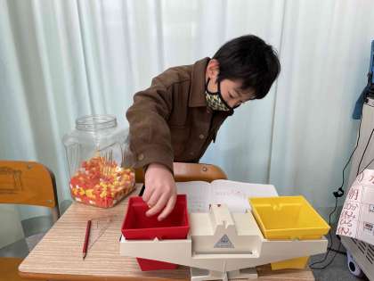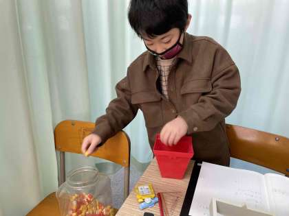 先週,調べたものの重さを数値化するために,つみきがいくつ分になるかを考えました。予想を立てながらつみきを箱に入れていきました。