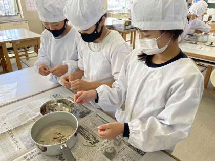 調理実習がありました。20分休みから,みそ汁とお米の準備をしました。にぼしの頭とはらわたを取りました。