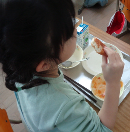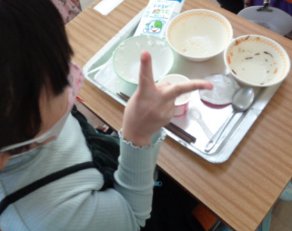完食できる日が続いています。今日は、今まで苦手だった揚げパンを全部食べきることができました!すごい!「甘くて美味しい〜!」と味わって食べていました。