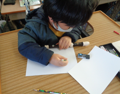 はとぶえで、学用品や楽器の絵を描きました。塗らないように、点で色を表現しました。筆箱とリコーダー、上手に描けたね。