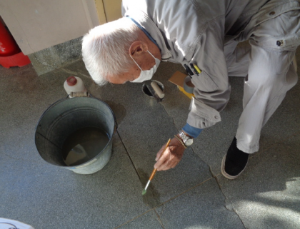 皆が転ばないように、校務支援員さんが廊下の修理をしてくれていました。学校では安全点検をしっかり行い、皆さんの安全を守っています。もしも危険な箇所を見つけたら、近くにいる先生に教えてくださいね。