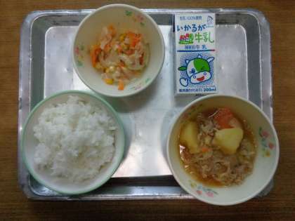 11月30日の給食は「ごはん、牛乳、肉じゃが、大根サラダ、手作りドレッシング」でした。