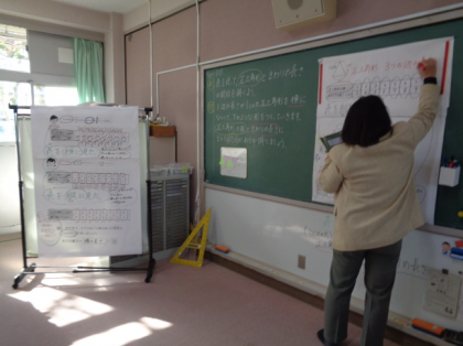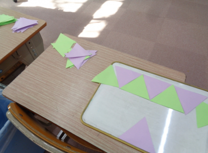 算数の「変わり方」の学習をしています。正三角形の数と周りの長さの関係について考えています。