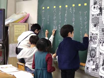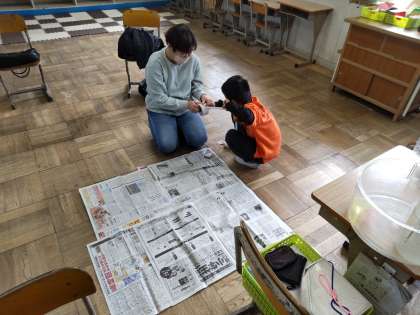 今日は,2年生と4年生のオープン参観がありました。2年生は,カタカナで書く言葉を使って文を書いたり,水のかさを比べる学習をしたりしていました。4年生は,「面積」の学習で,新聞紙を使って,1平方メートルの広さを作っていました。