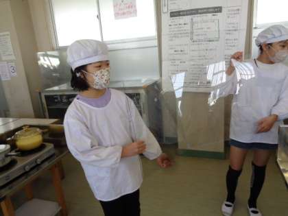 料理の完成後は,班の人と協力してパーテーションを机の上に設置します。