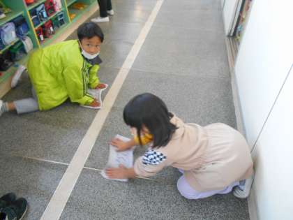 冷たくても,ぞうきんをしっかりしぼって頑張っています。ピカピカの廊下で気持ちがいいですね。