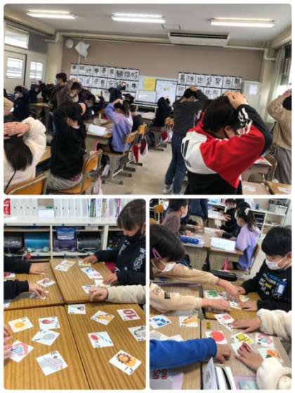 冬休みに行った場所や食べたものを英語で話したあと,アルファベットかるたをしました。