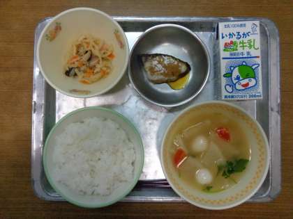 3学期の給食が始まりました。初日はお正月献立で、「ごはん、牛乳、すまし雑煮、いためなます、ぶりの照り焼き」でした。