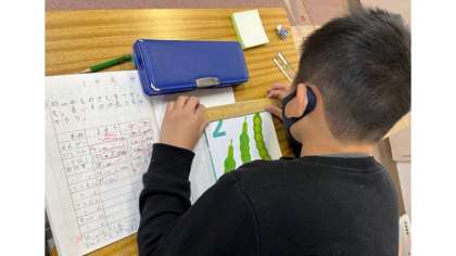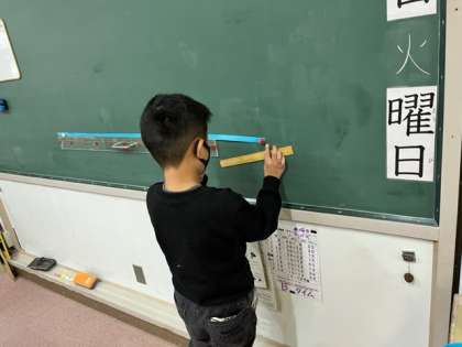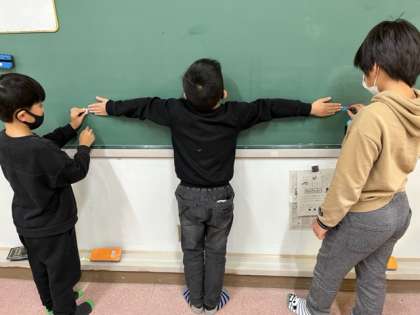 新しい単位を学習し,最後に,1メートルざしを使って,両手を広げた長さを測りました!