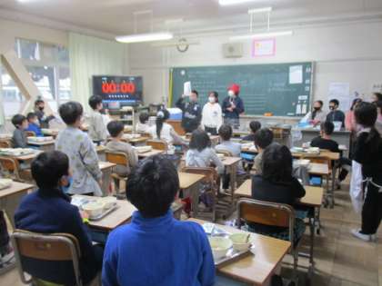 給食委員会の人が今月の目標を伝えに来てくれました。「感謝して食べよう」を意識しながら給食が食べられるといいですね。